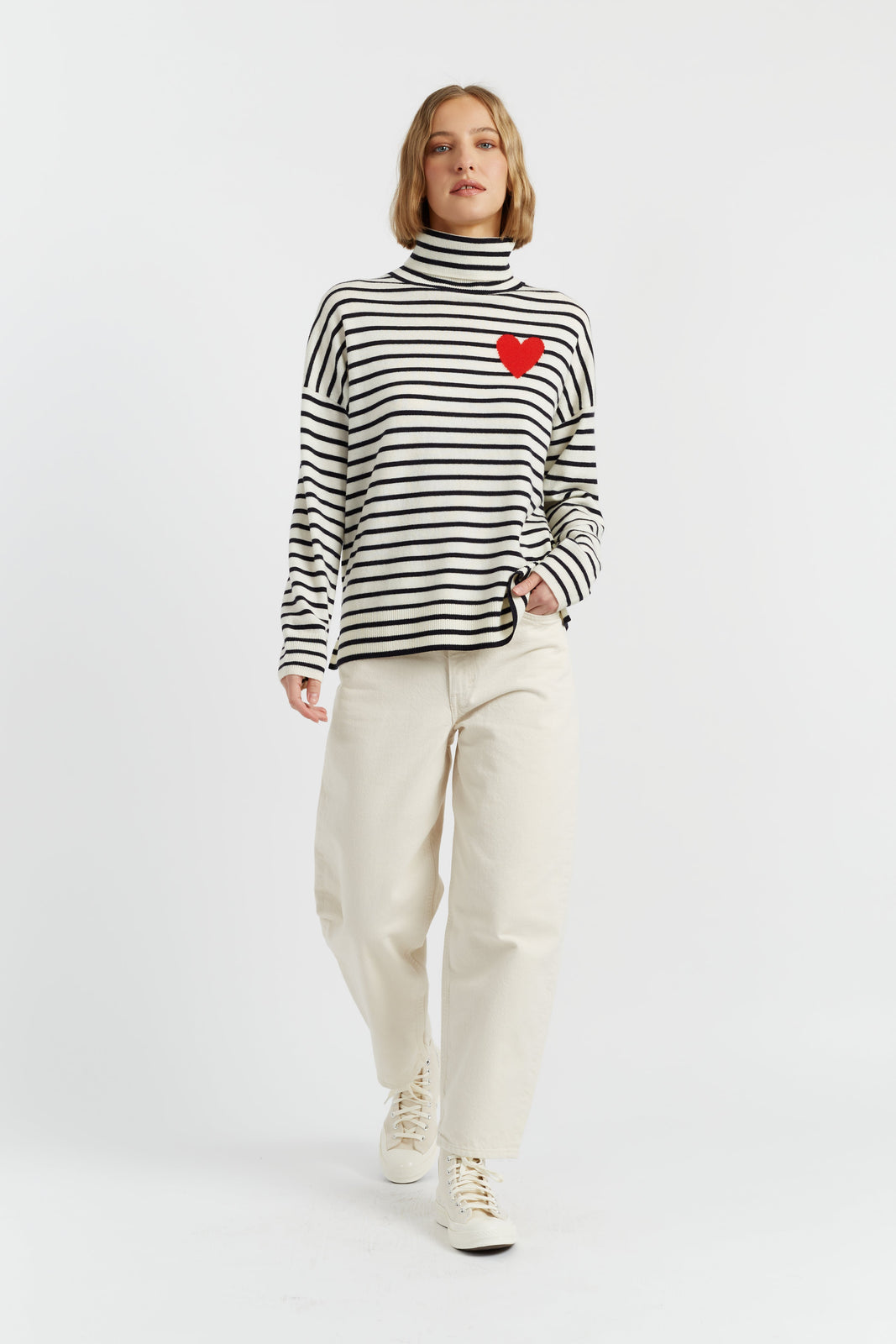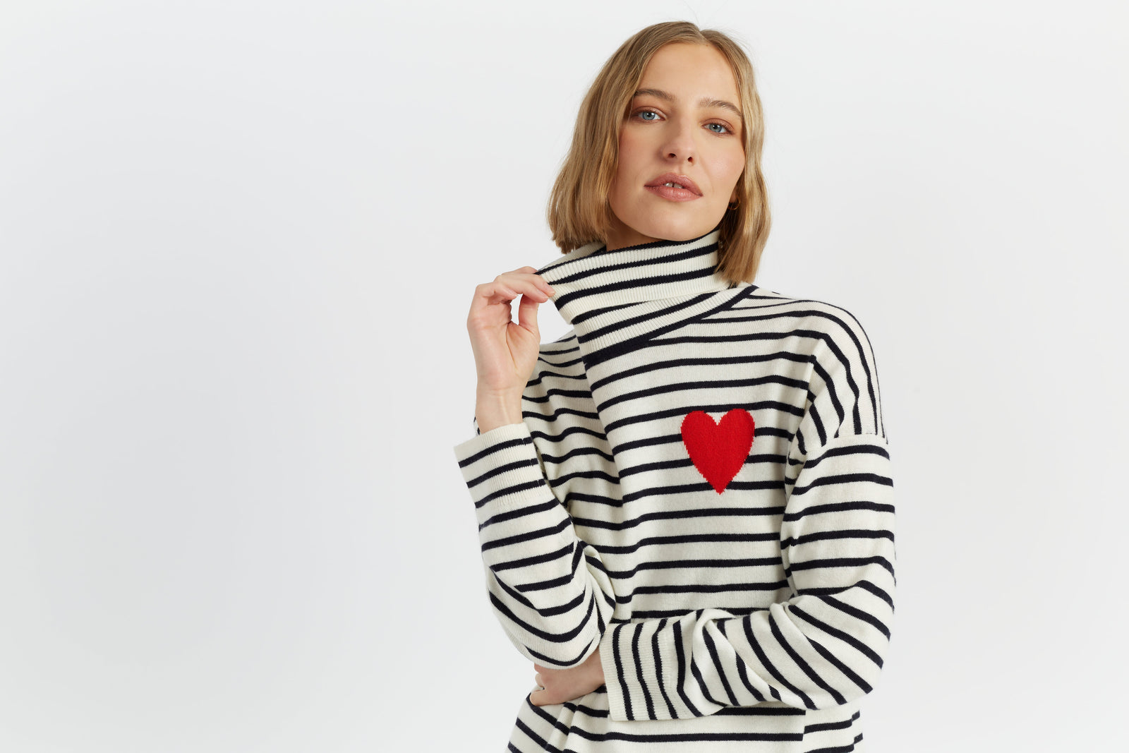 The Cream-Navy Wool-Cashmere Heart Breton Rollneck Sweater is a Slouchy.