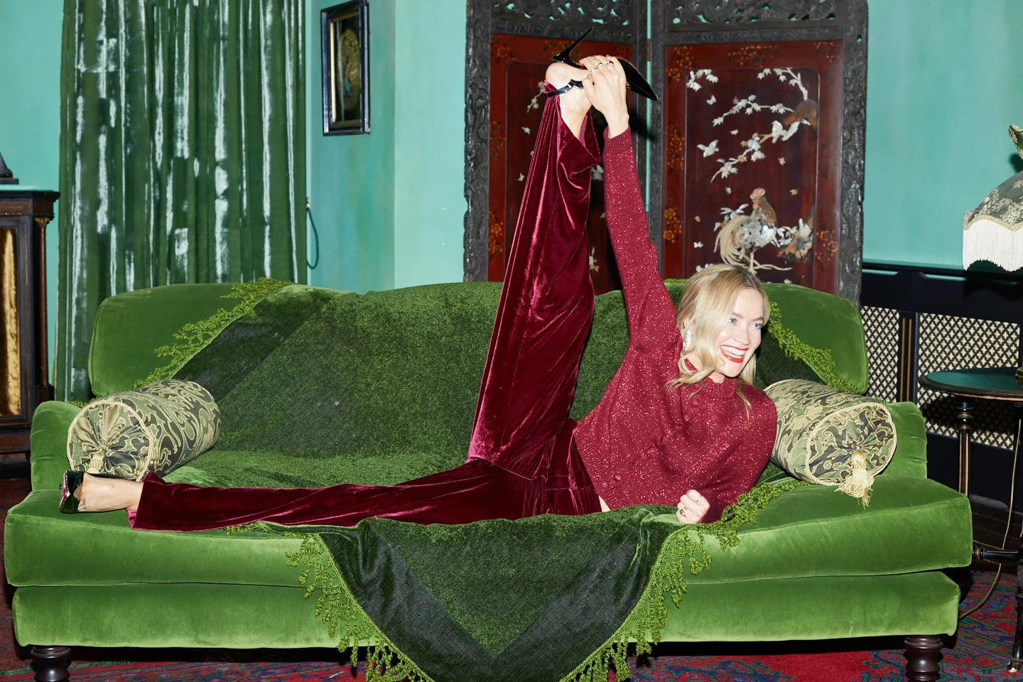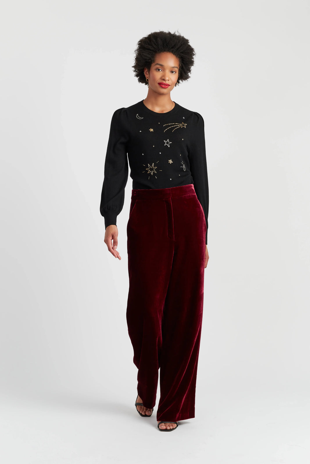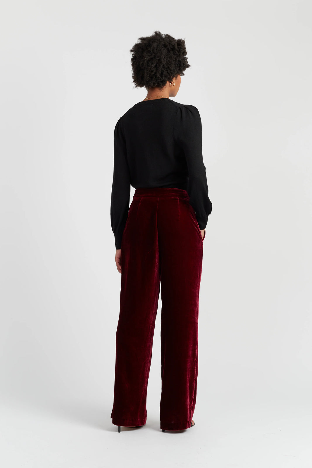 Elevated and effortlessly cool, these C&P x Laura Whitmore wide-leg trousers in claret velvet are your new evening go-to. Designed to sit high on the waist and fall to a soft, fluid drape, they balance comfort and sophistication with ease.