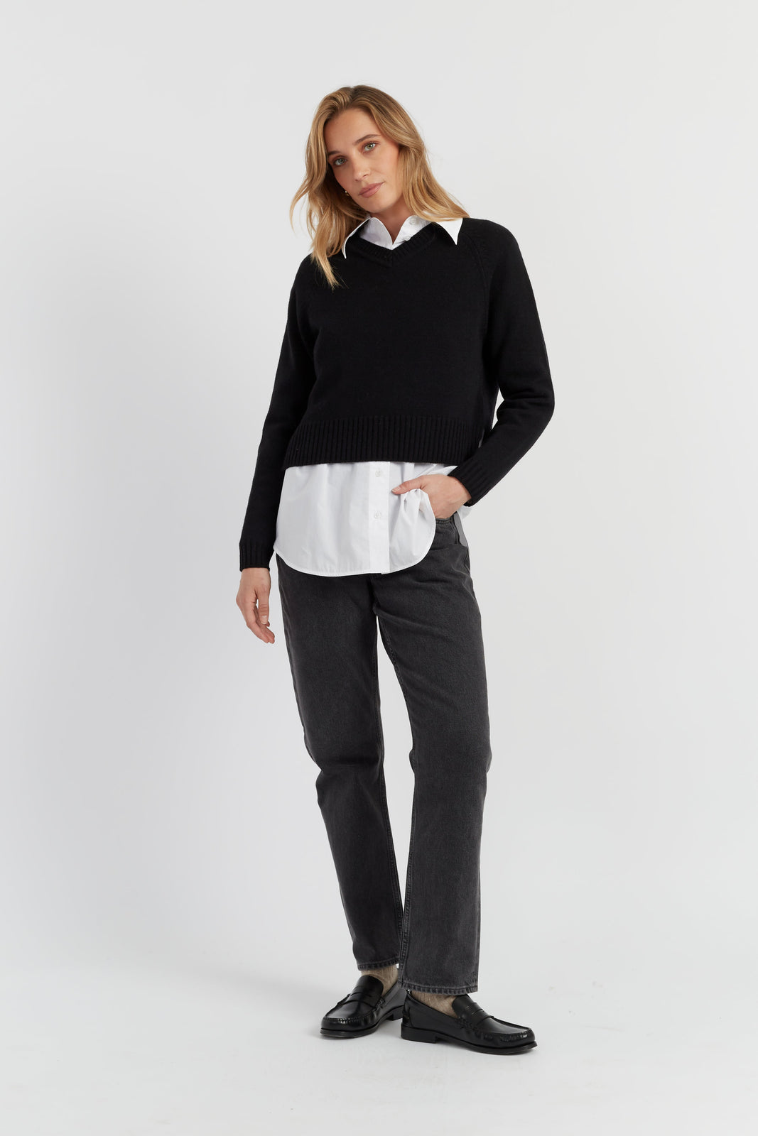 The Black Pure Cashmere Cropped V-Neck Sweater is a Cropped.