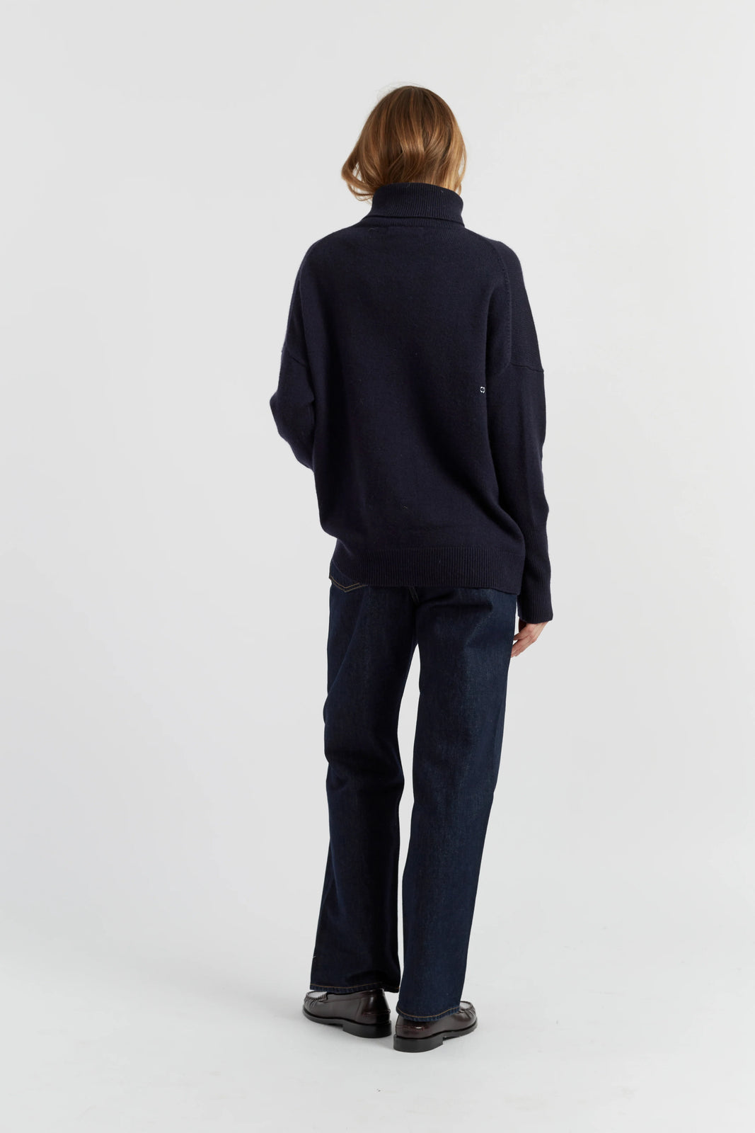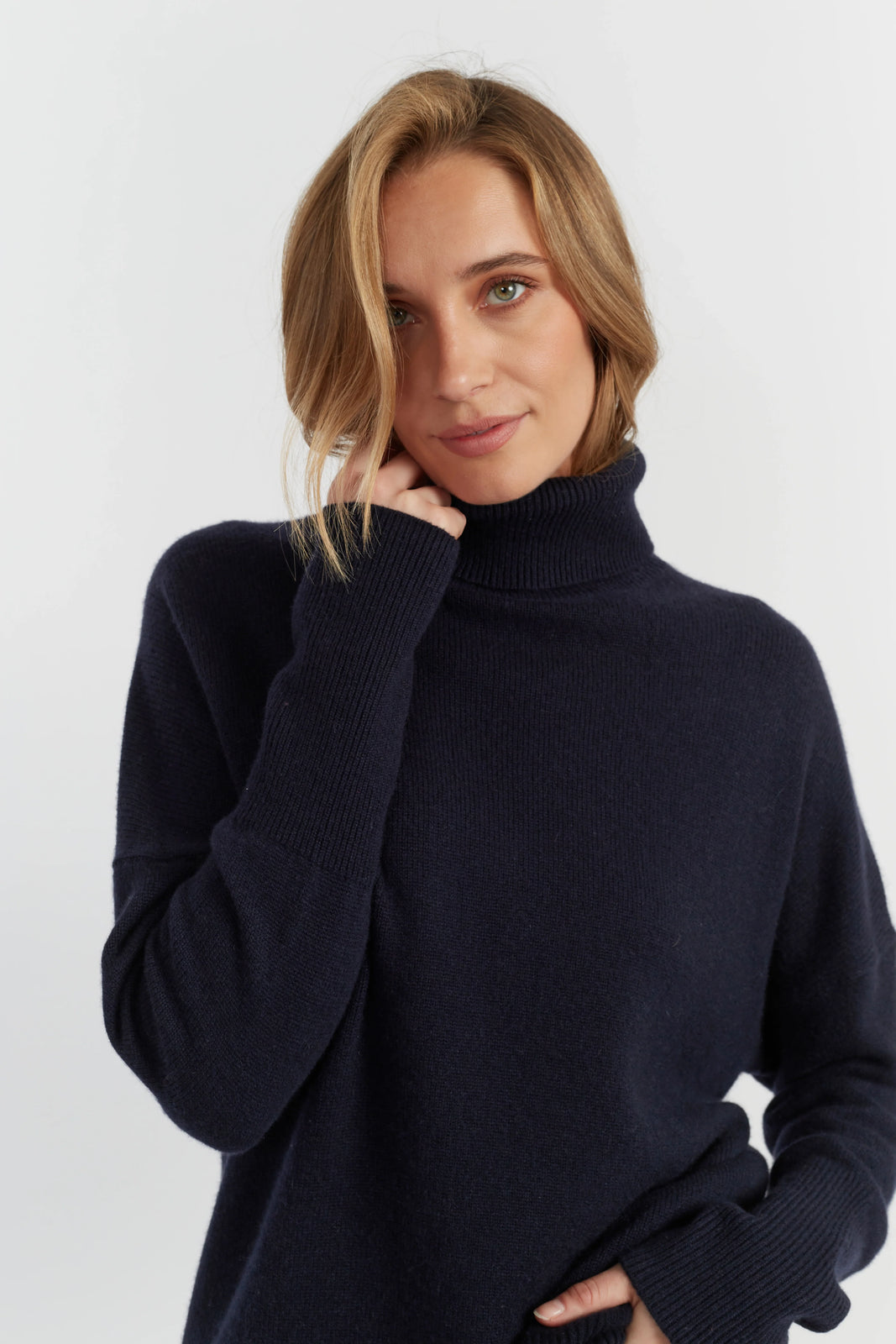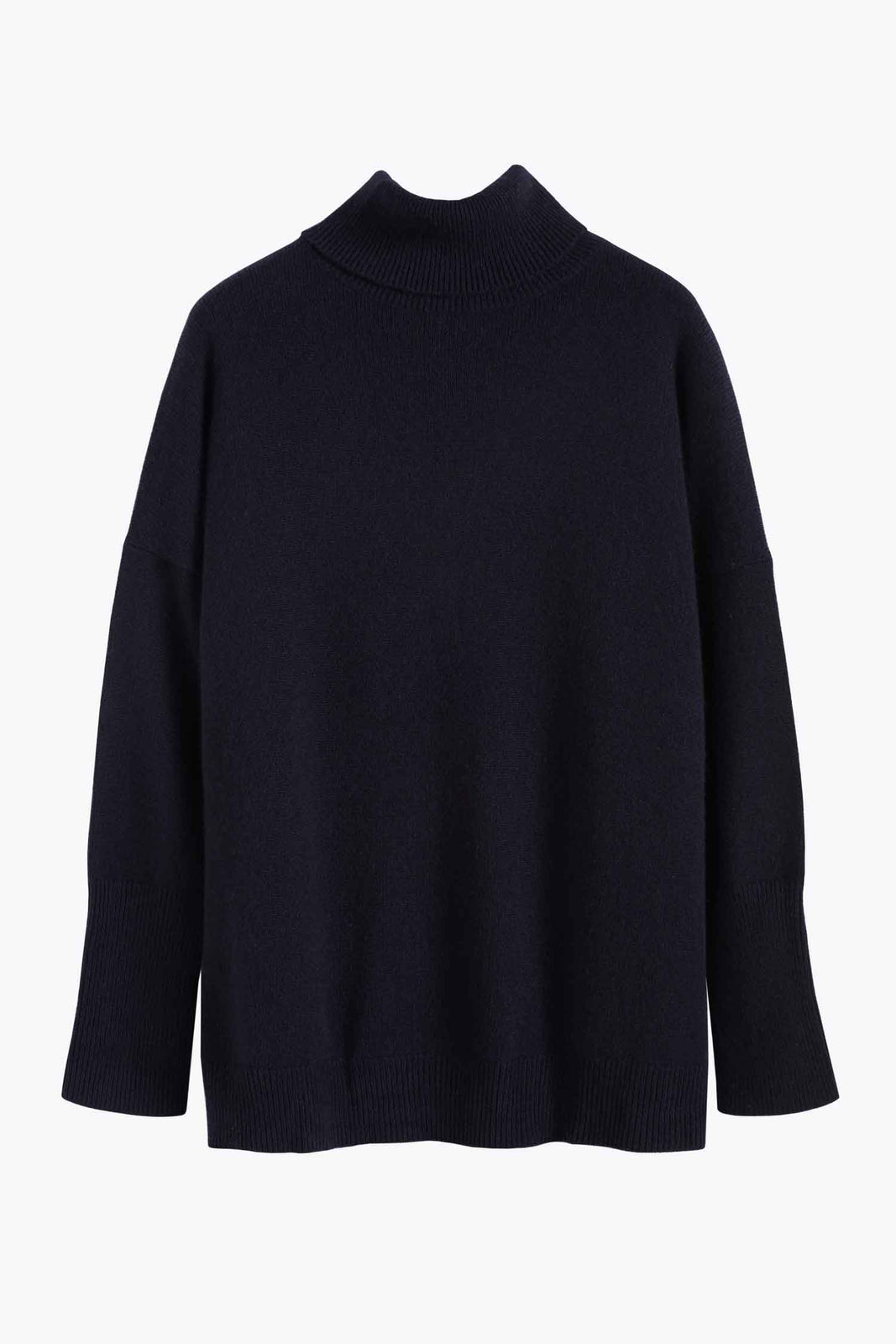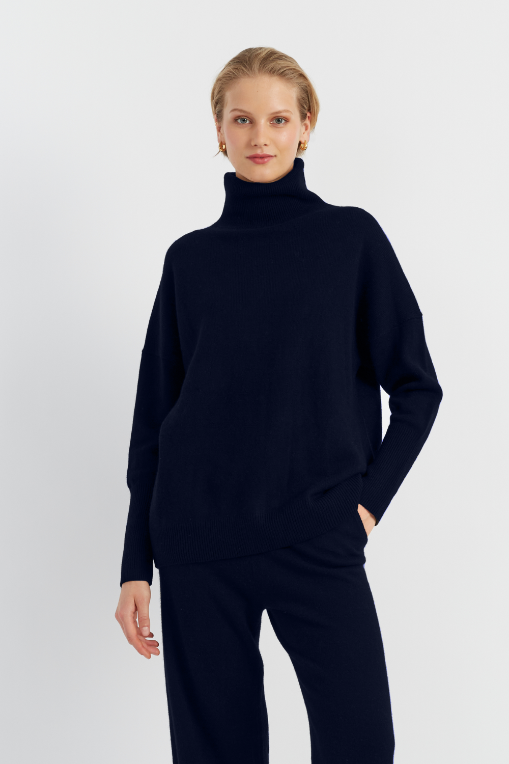 The Navy Pure Cashmere Rollneck Sweater is a slouchy.