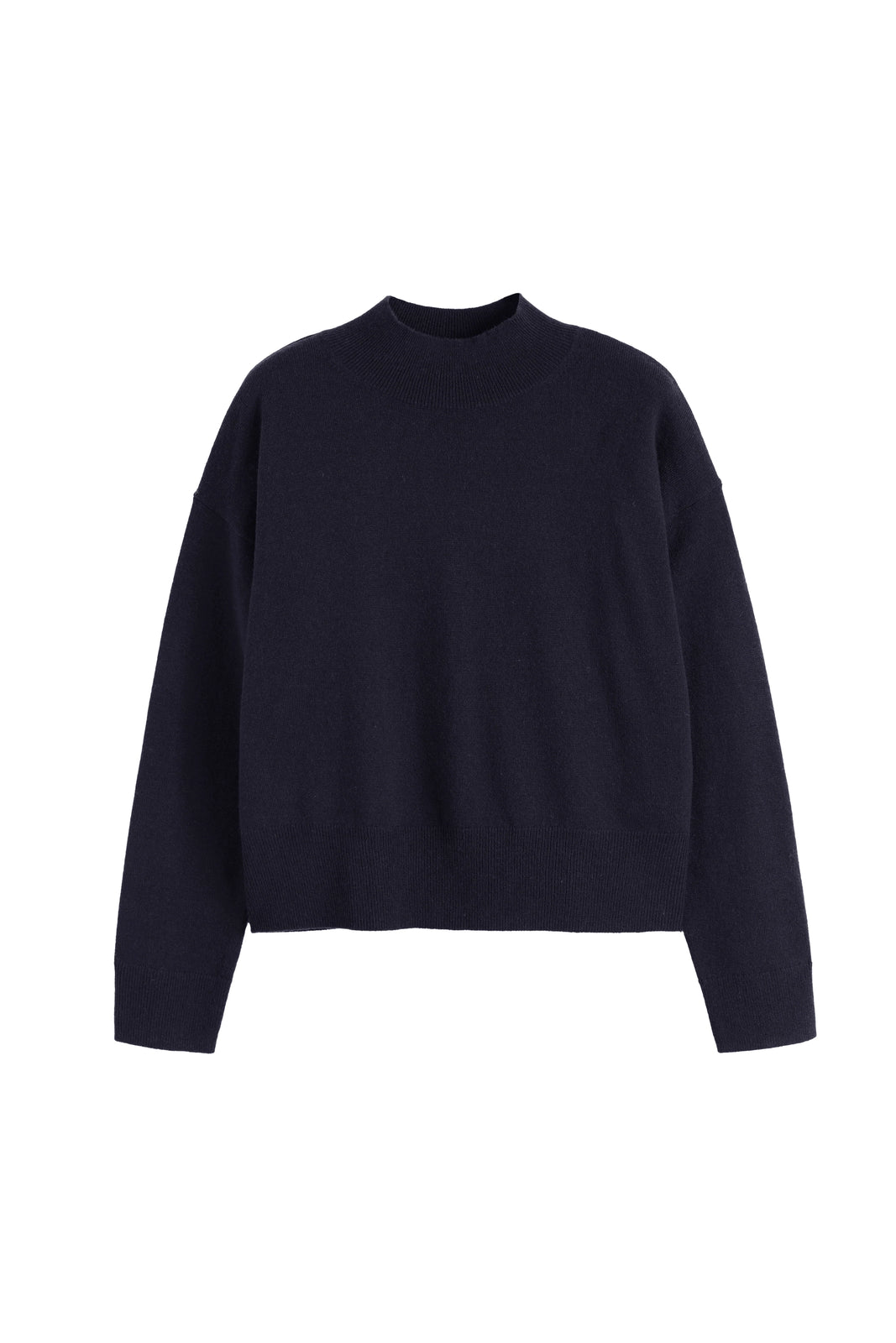The Navy Wool-Cashmere Funnel Neck Sweater is a Classic.