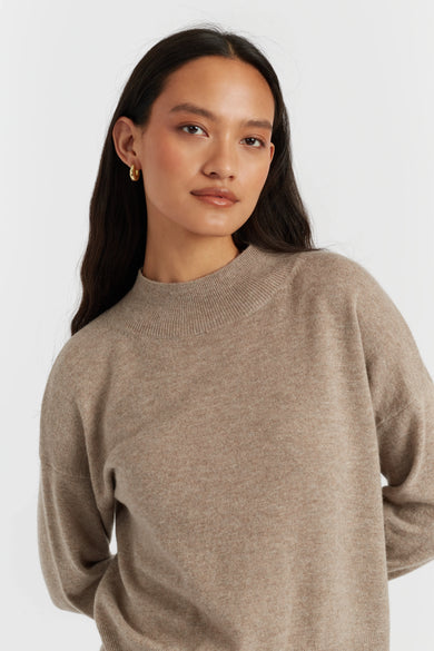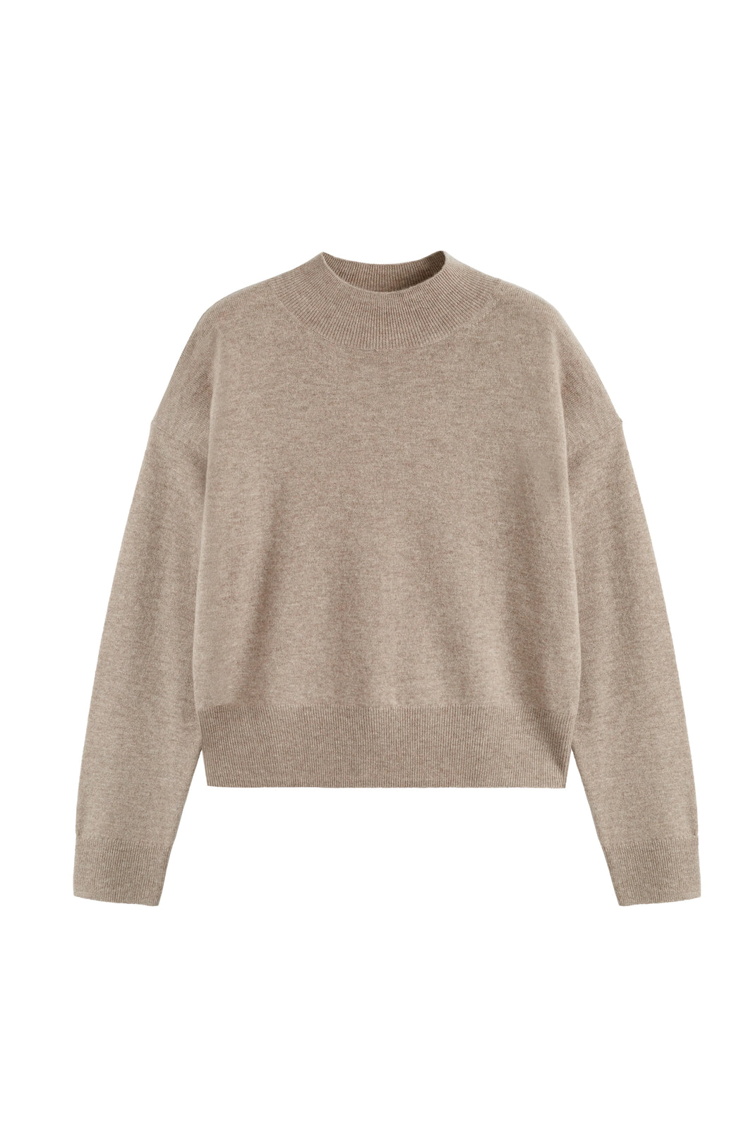 The Warm-Oatmeal Wool-Cashmere Funnel Neck Sweater is a Classic.