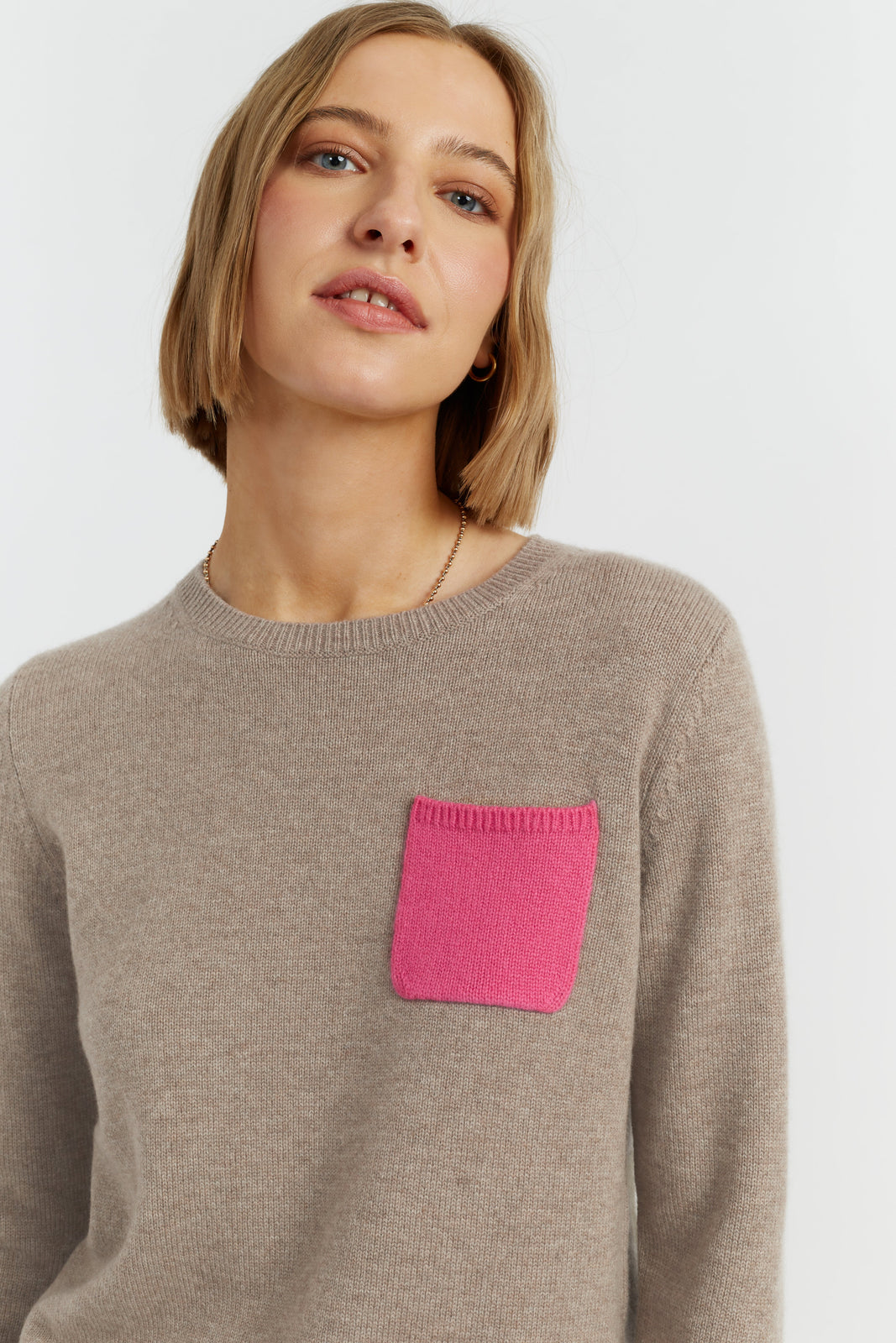 The Warm-Oatmeal Wool-Cashmere One Pocket Sweater is a Classic.